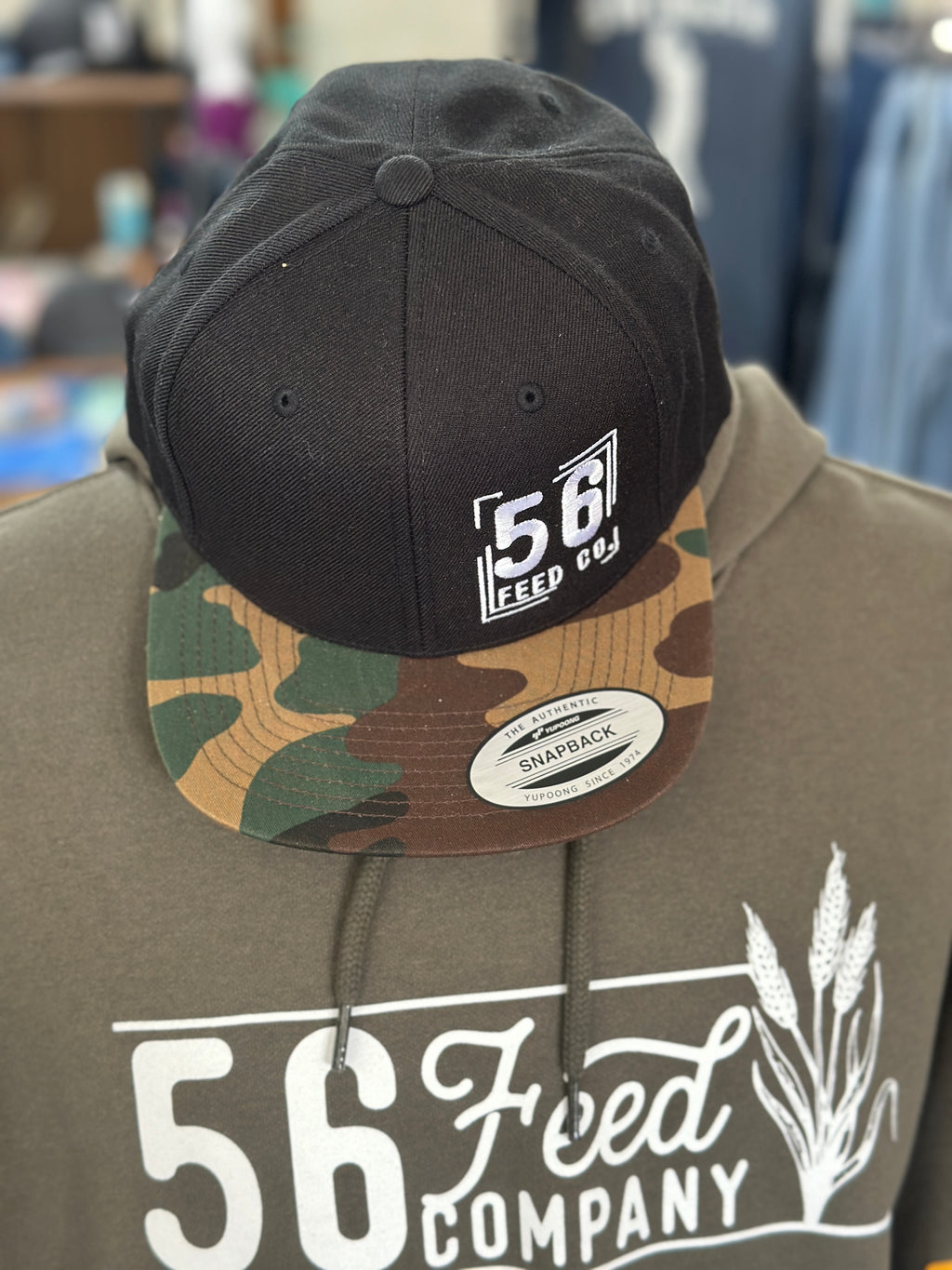 56 Feed Co | Black Camo with White Thread YP Classics Adjustable Snapback Premium Flat Bill