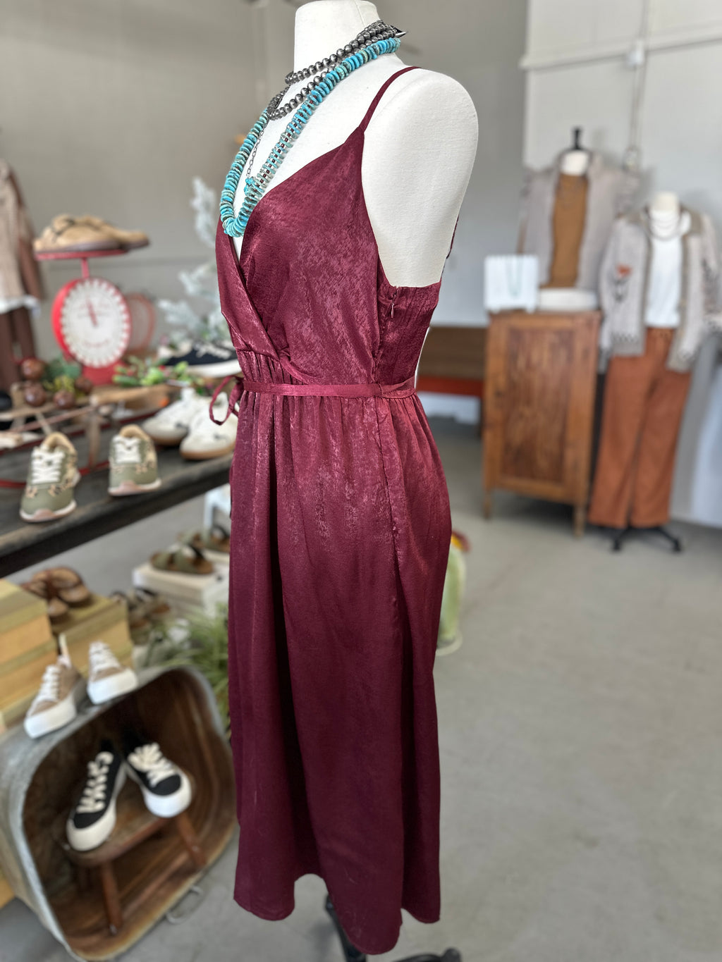 Women's Wine Crushed Satin Spaghetti Strap Long Surplice Dress