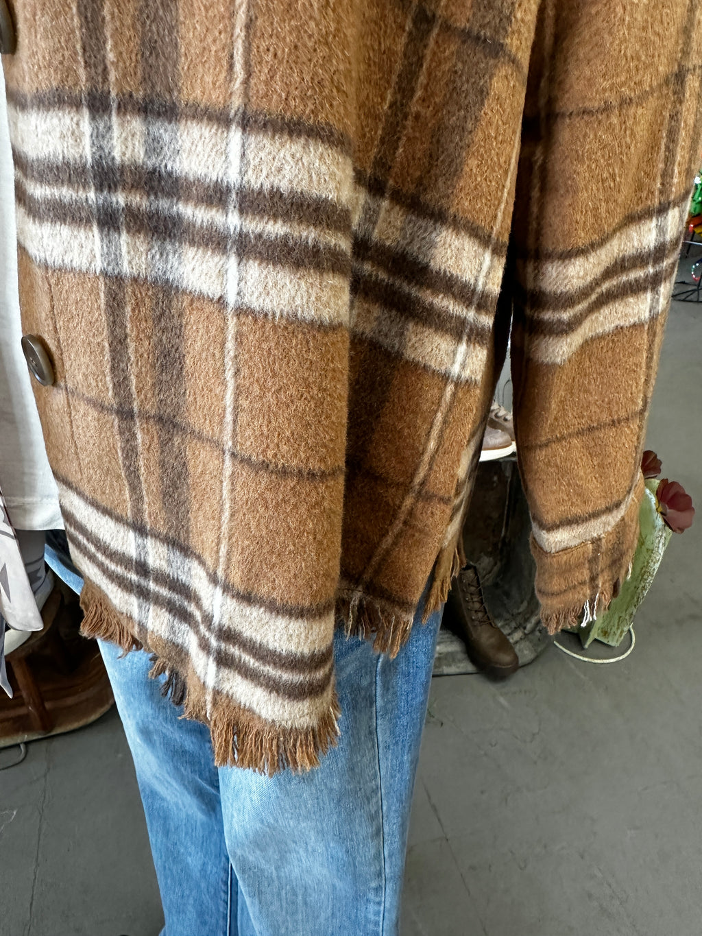 Women's Brown Sugar Fringe Detailed Plaid Button Down Jacket