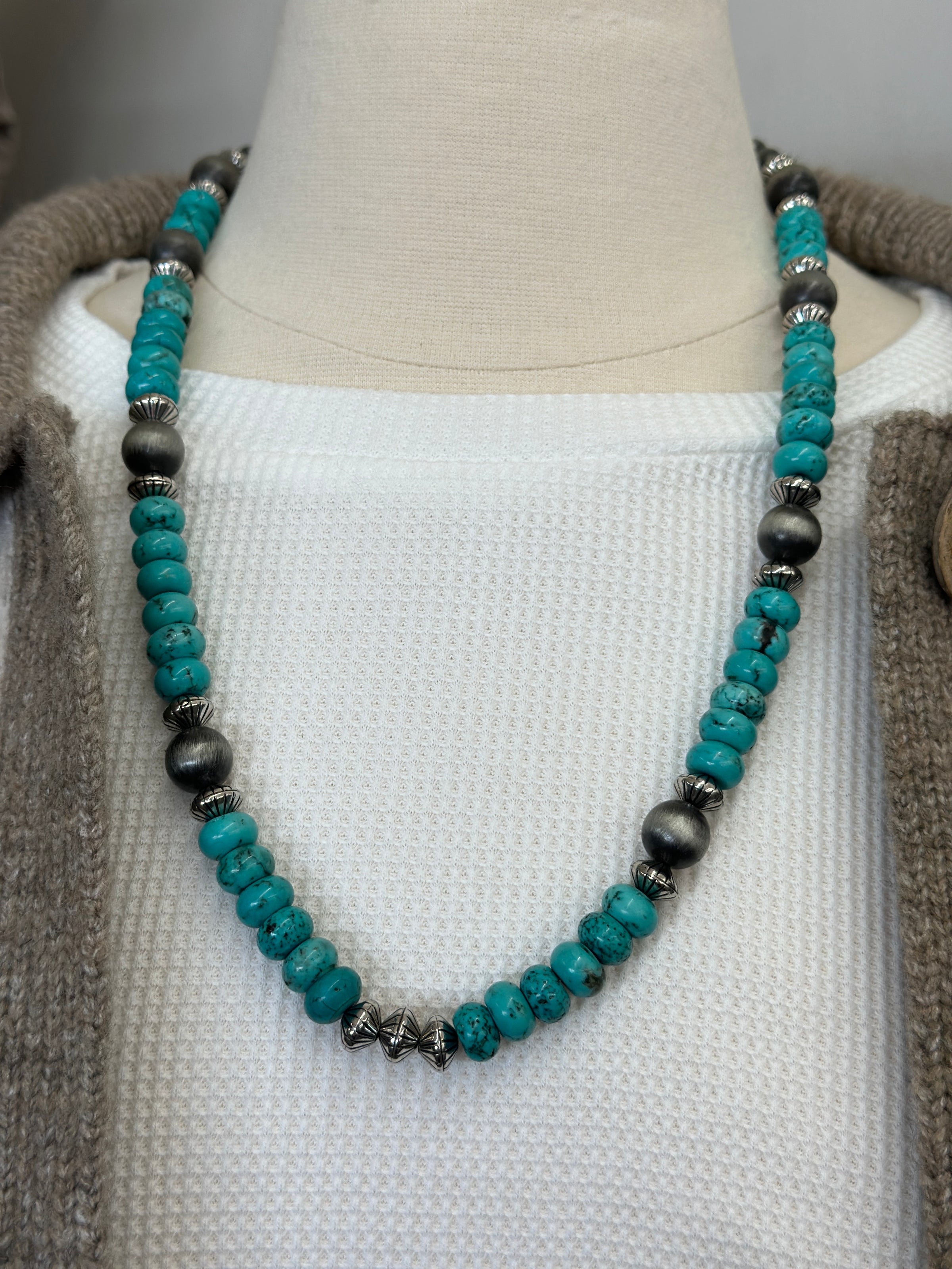 24 inches Turquoise Roundel + Silver Navajo Pearl Bead Necklace