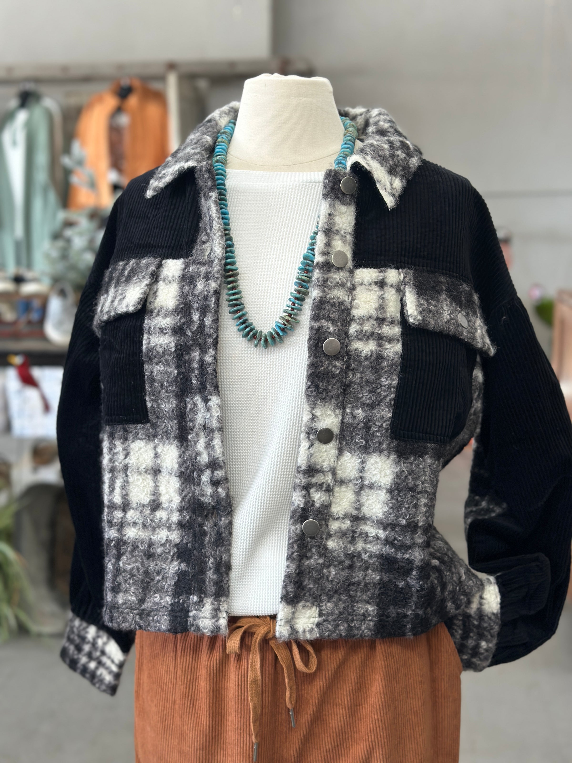 Women's Black + White Mixed Media Plaid Button Down Shacket
