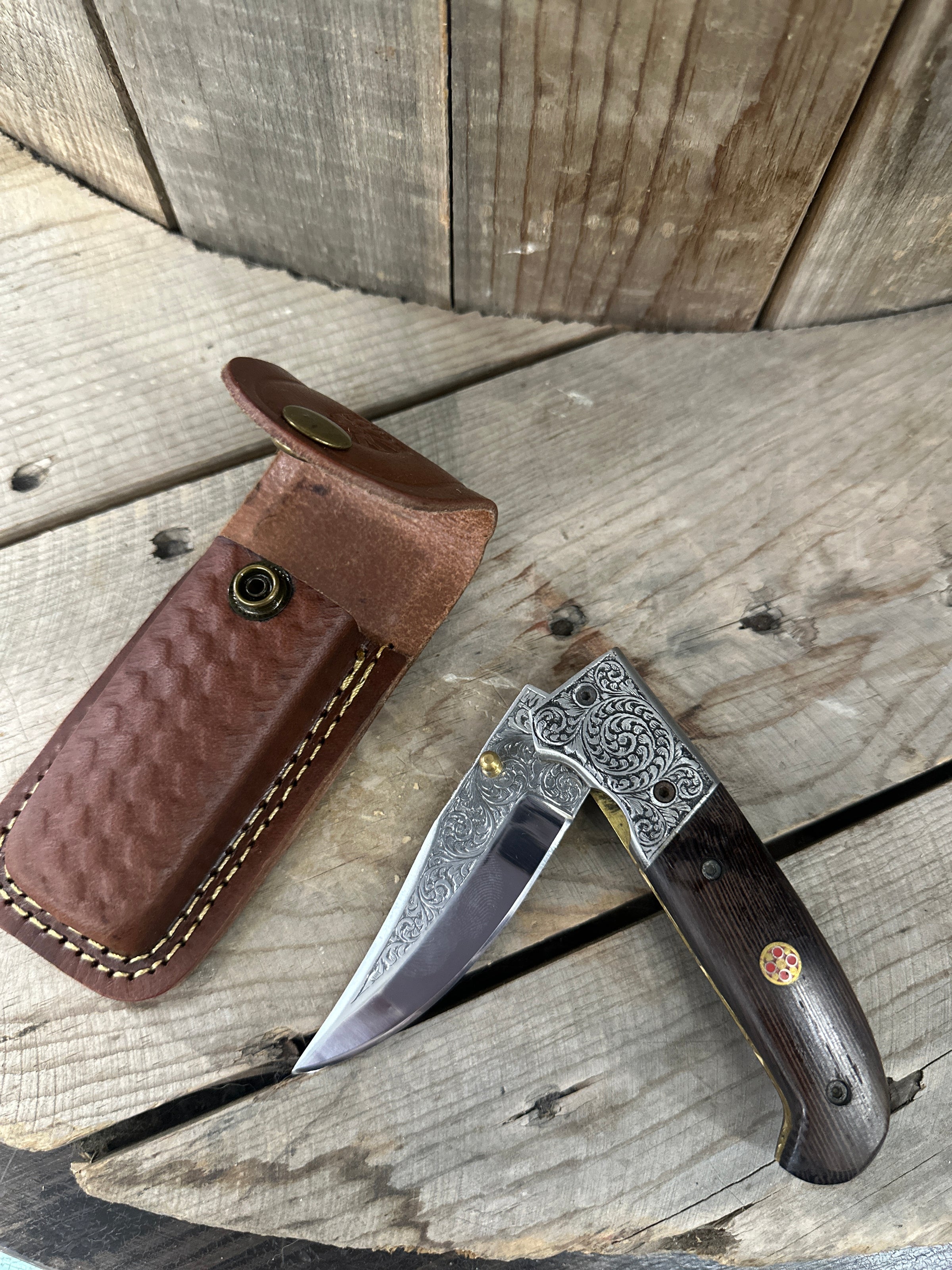 Titan International | Hand Engraved Damascus Inspired Detailing Folding Knife with Leather Sheath