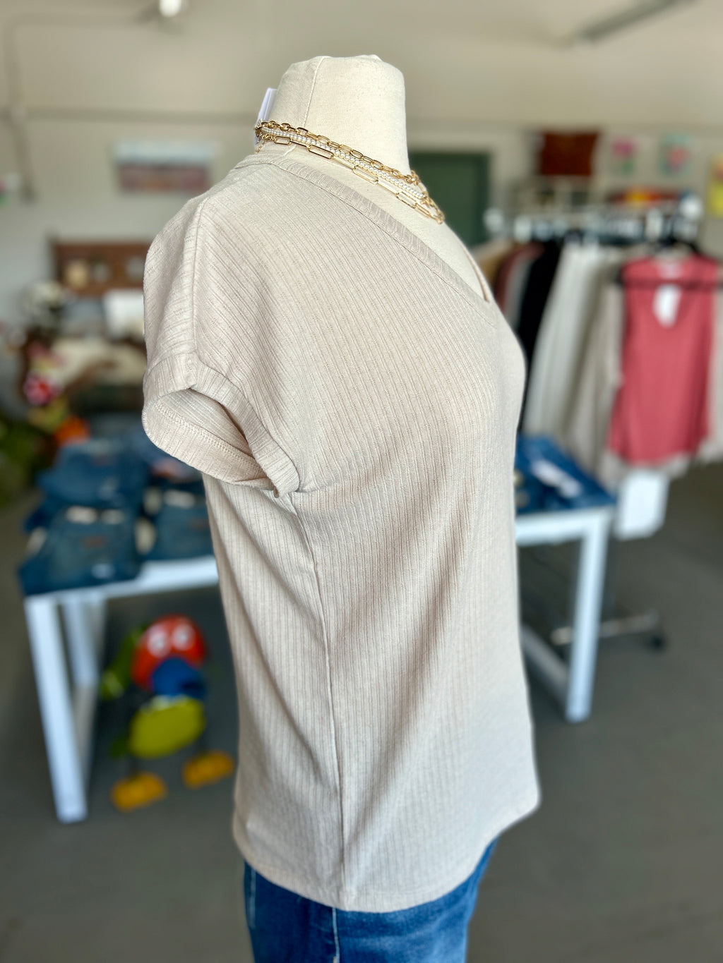 Staccato l Oatmeal Short Sleeve V-Neck Pointelle Knit Top