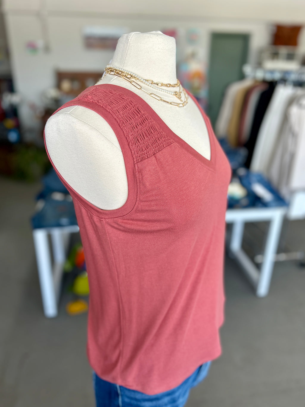 Staccato l Terracotta Sleeveless Smock Shoulder V-Neck Solid Knit Top