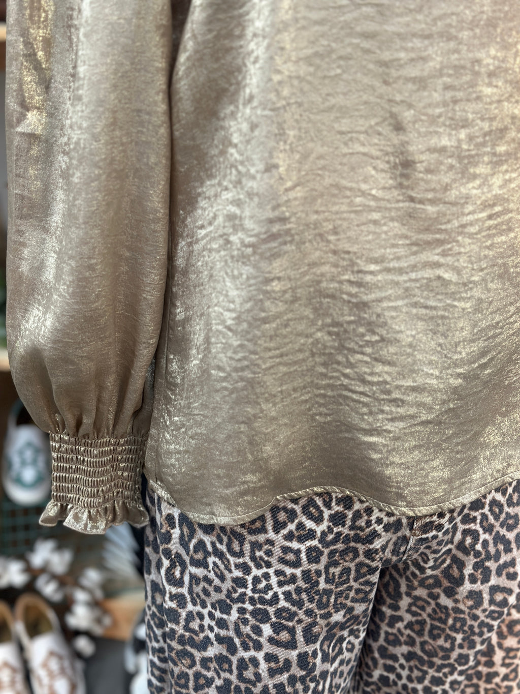 Women's Metallic Gold Round Neck Smocked Sleeve Blouse