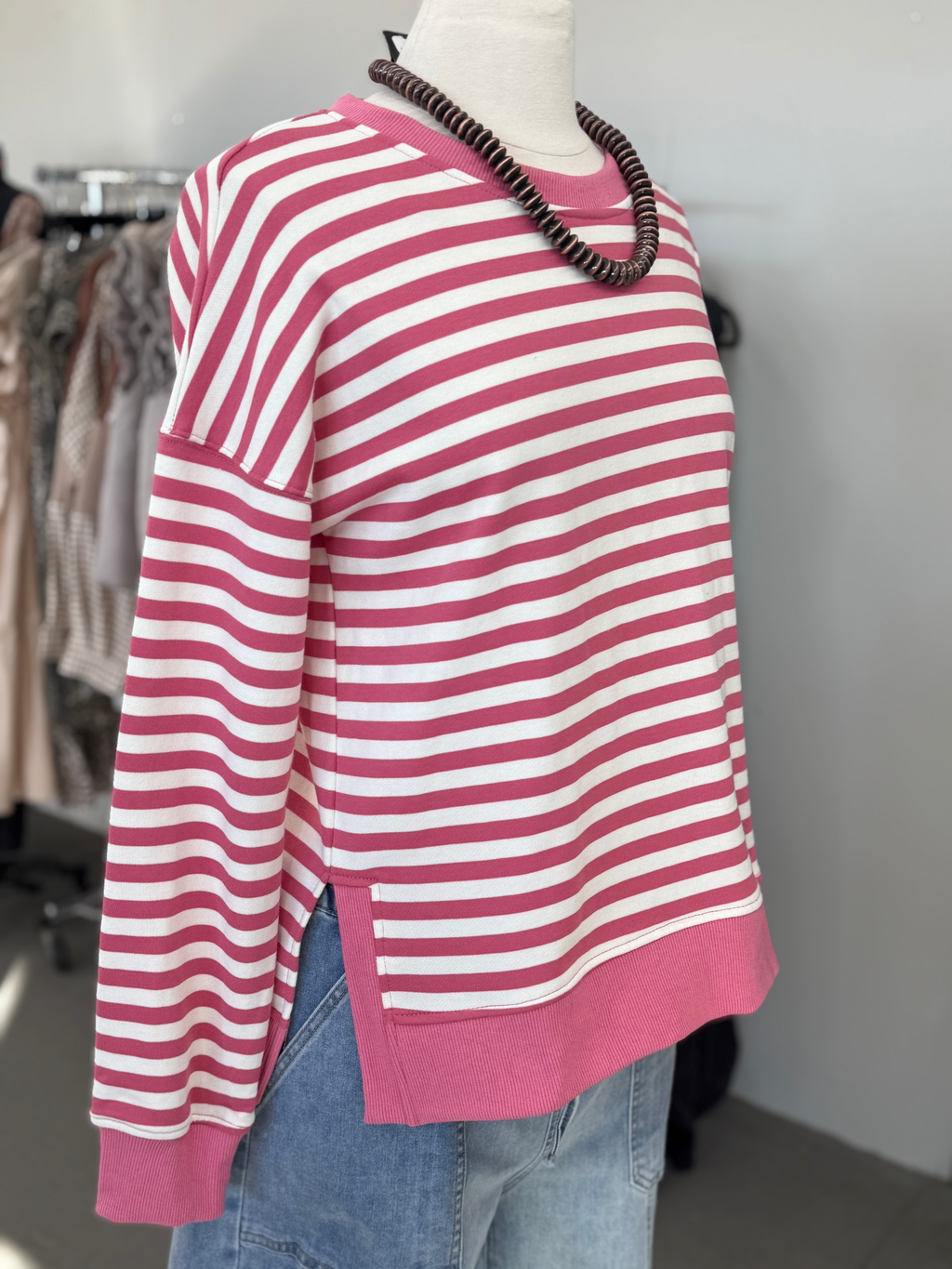 Women's Pink Striped Crew Neck Relaxed Fit Pullover