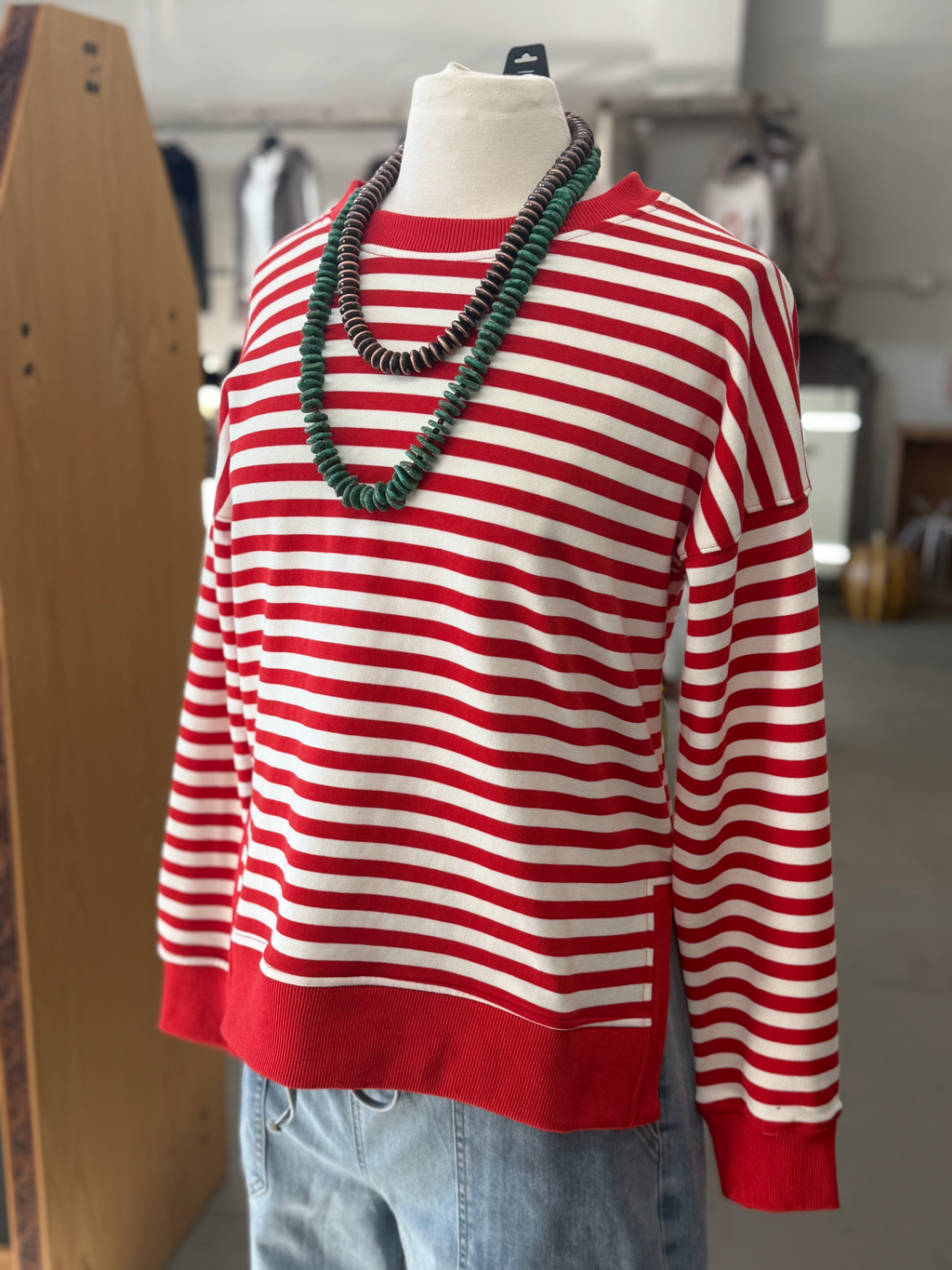 Women's Red Striped Crew Neck Relaxed Fit Pullover