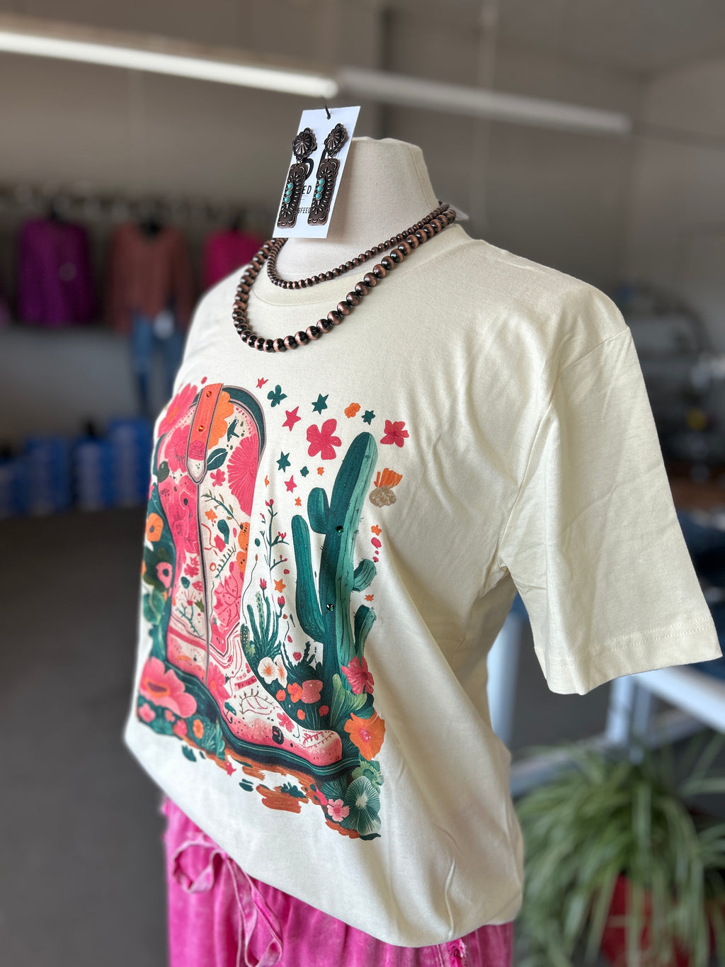 Texas True Threads | Neon Aztec + Cactus on Black Crew Neck T-Shirt
