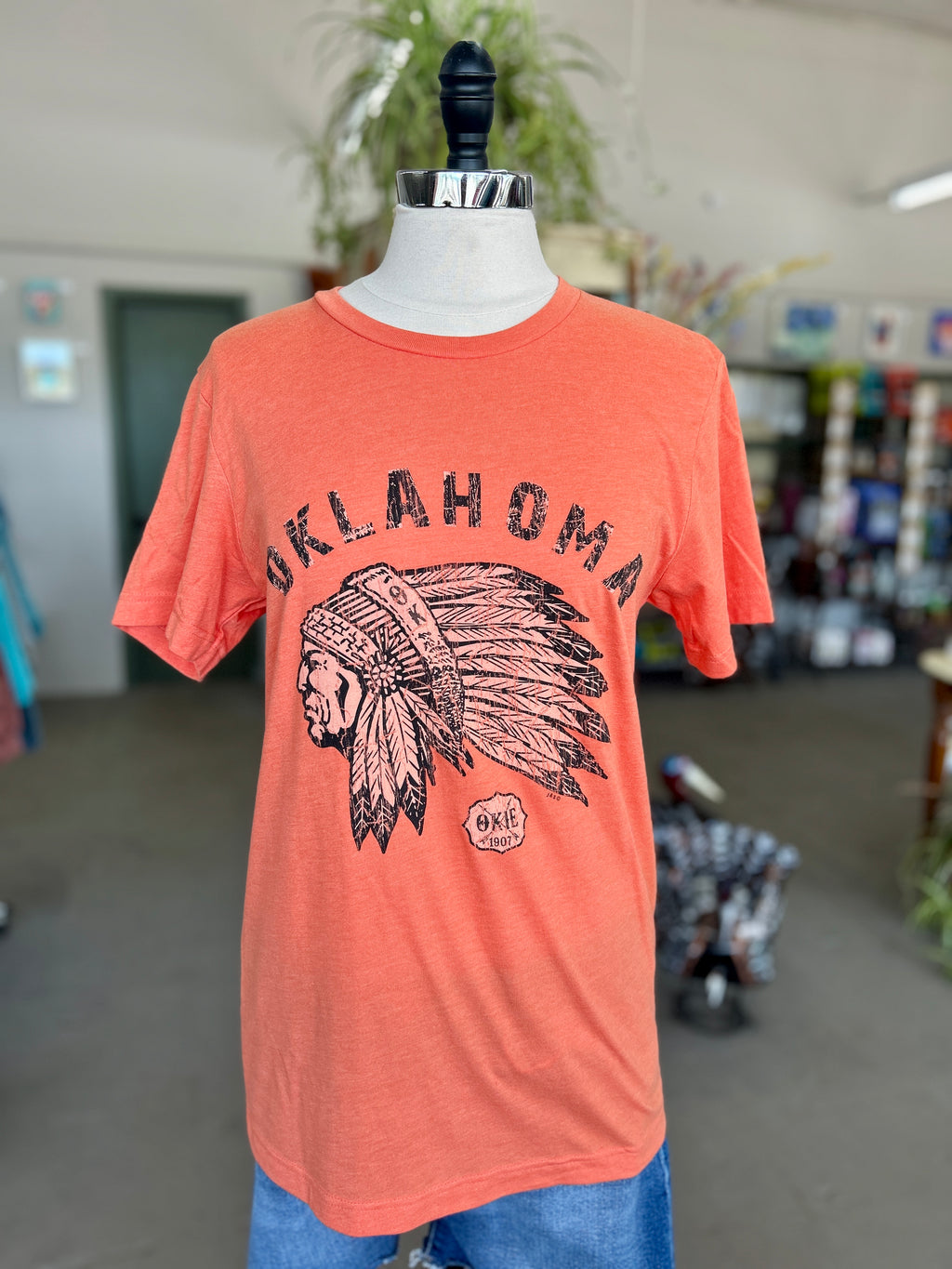 Oklahoma Indian Head Chief Tee l Solid Orange Crew Neck
