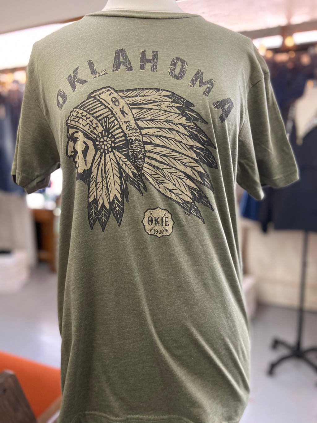 Oklahoma Indian Head Chief Tee l Olive Crew Neck