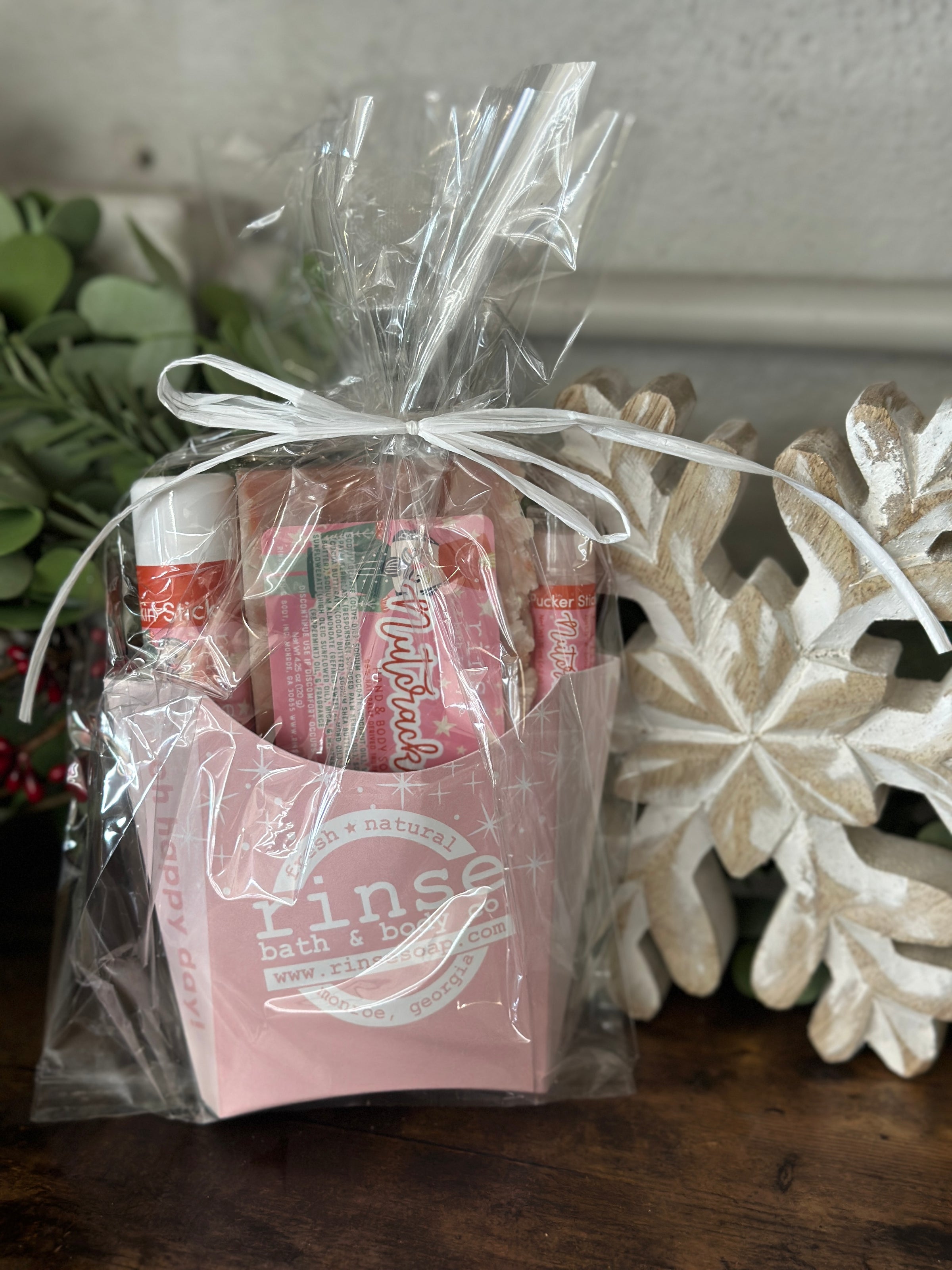 Our Nutcracker Holiday Fry Box contains one bar of soap, one skin stick, and one pucker stick. In our NEW Pink Fry Box! Nutcracker- Visions of pink, glitter, & a Vanilla Peppermint scent. Available for the Holidays for all of your Sugar Plum Fairies! Our Fry bundles are all packaged up in a Fry Box (Color is subject to change) and tied up in a cello bag with a ribbon. One less thing for you to worry about! The perfect neighbor gift, hostess gift, teacher gift, employee gift, boss gift, stocking stuffer, white elephant gift, great for anyone!