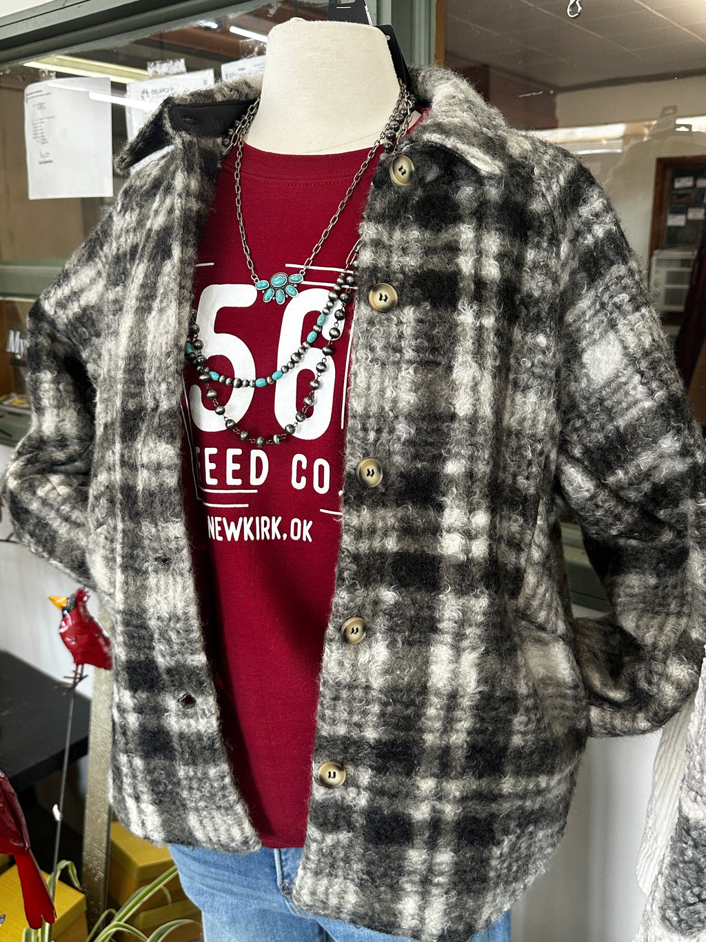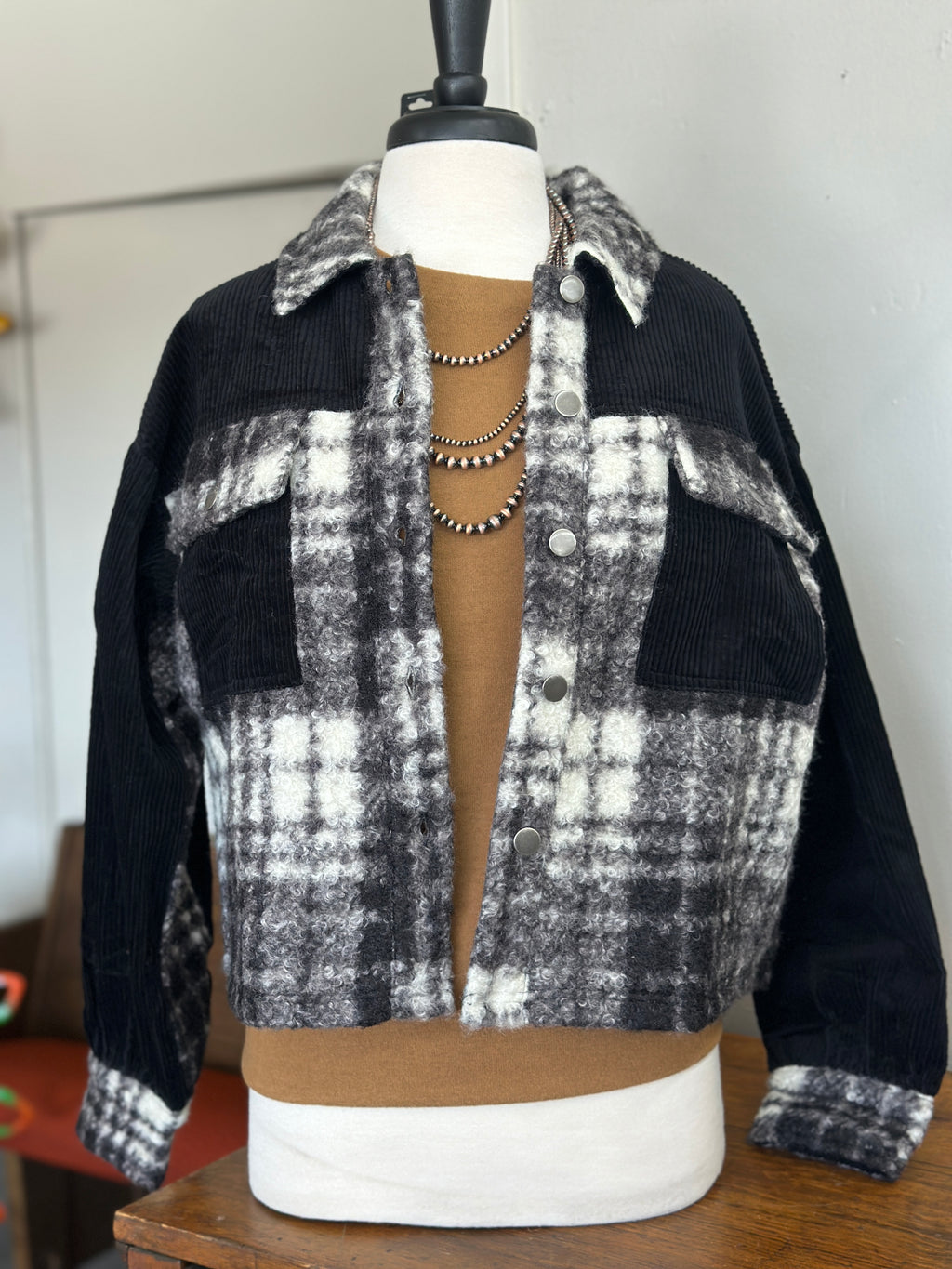 Women's Black + White Mixed Media Plaid Button Down Shacket