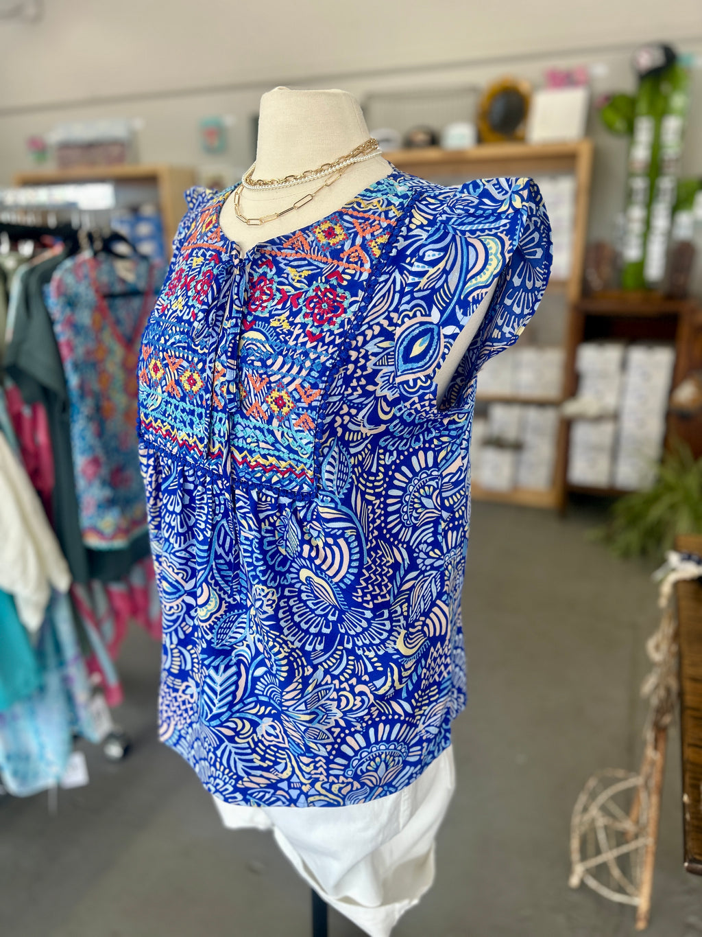 Women's Blue Embroidered Short Ruffle Sleeve Top