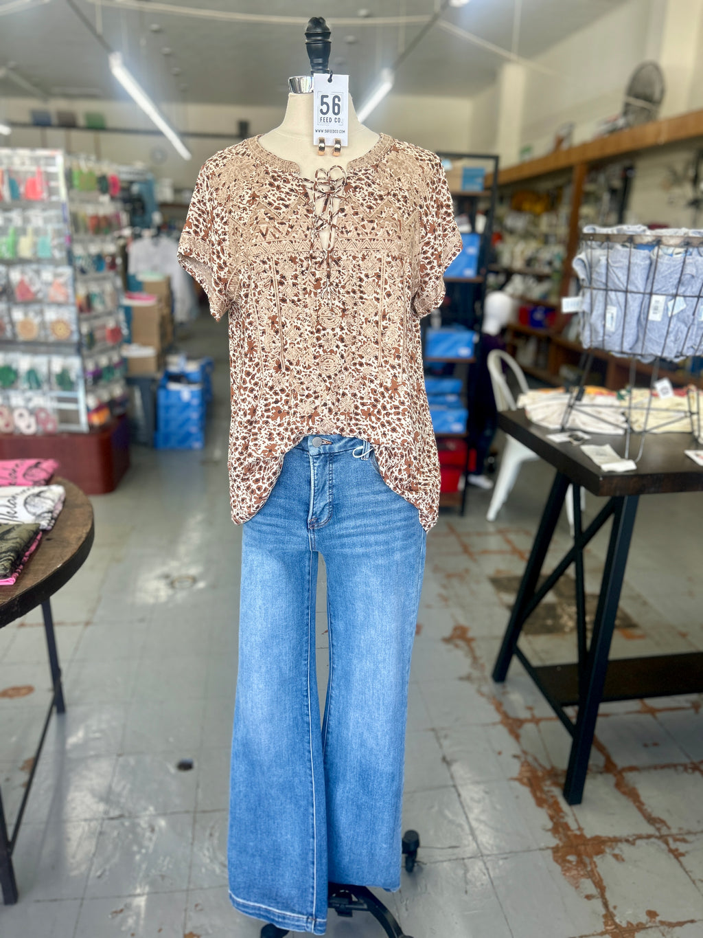 Staccato l Oatmeal Short Sleeve V-Neck Pointelle Knit Top