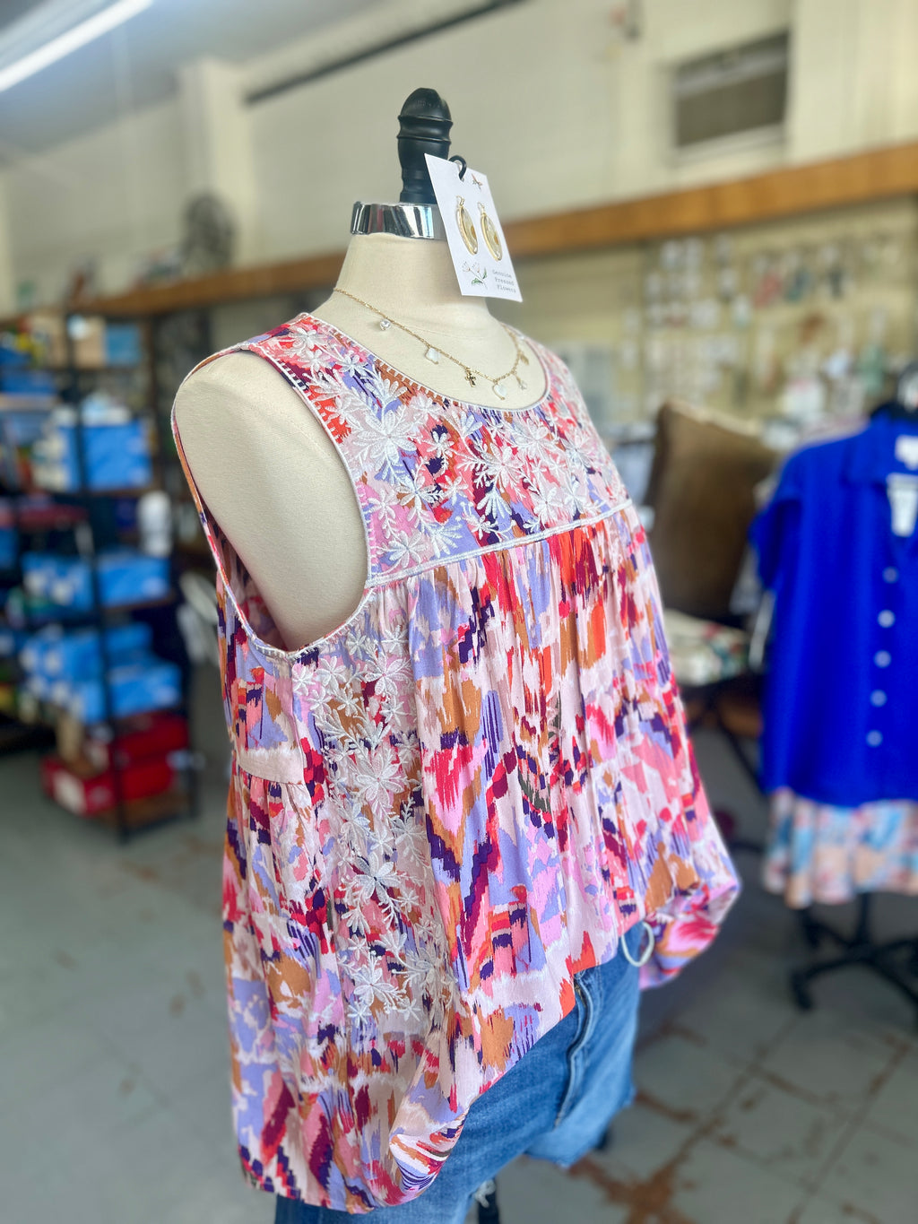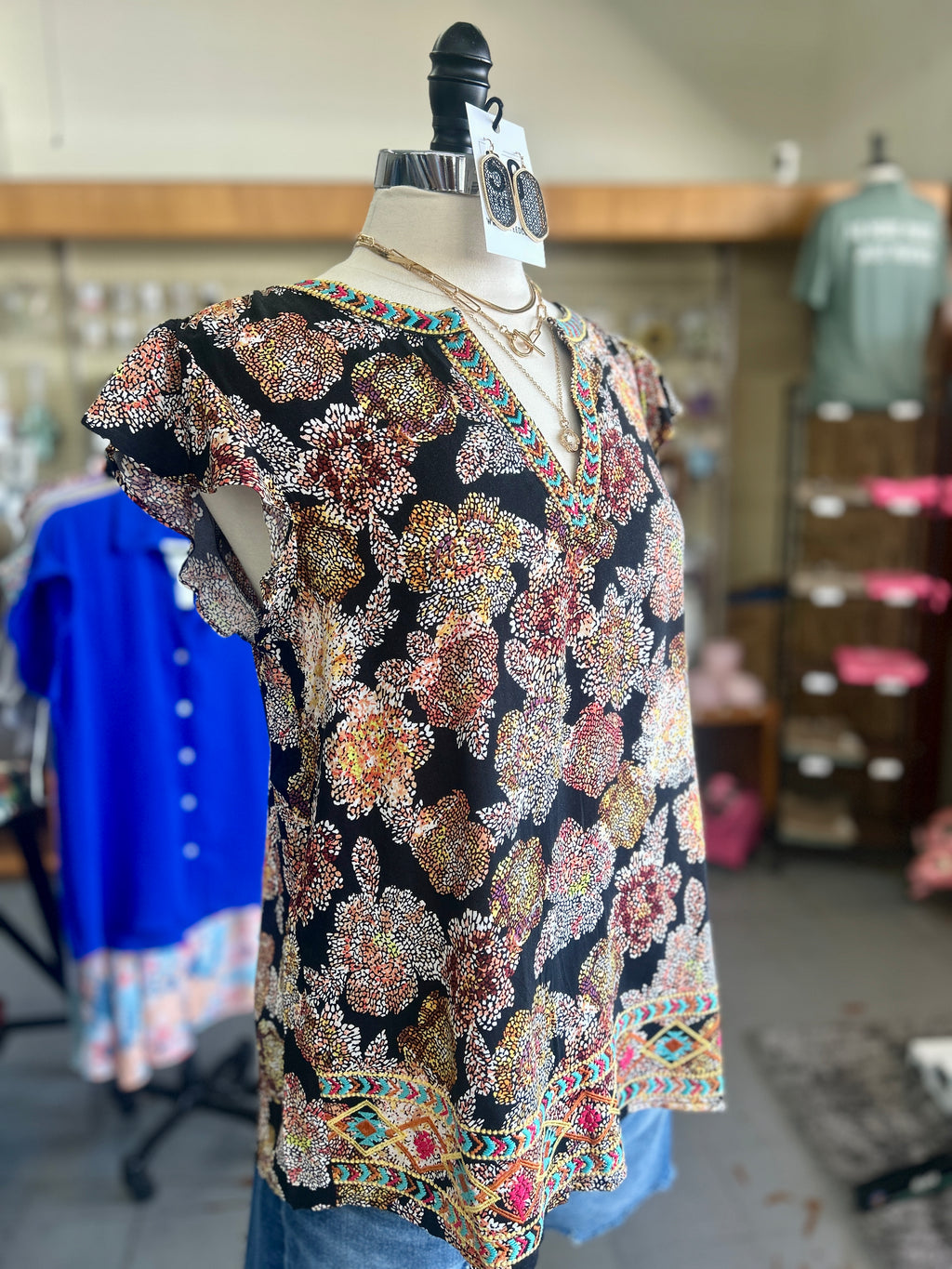 Women's Floral Print Embroidered Neckline with Pom Pom Short Sleeve Top