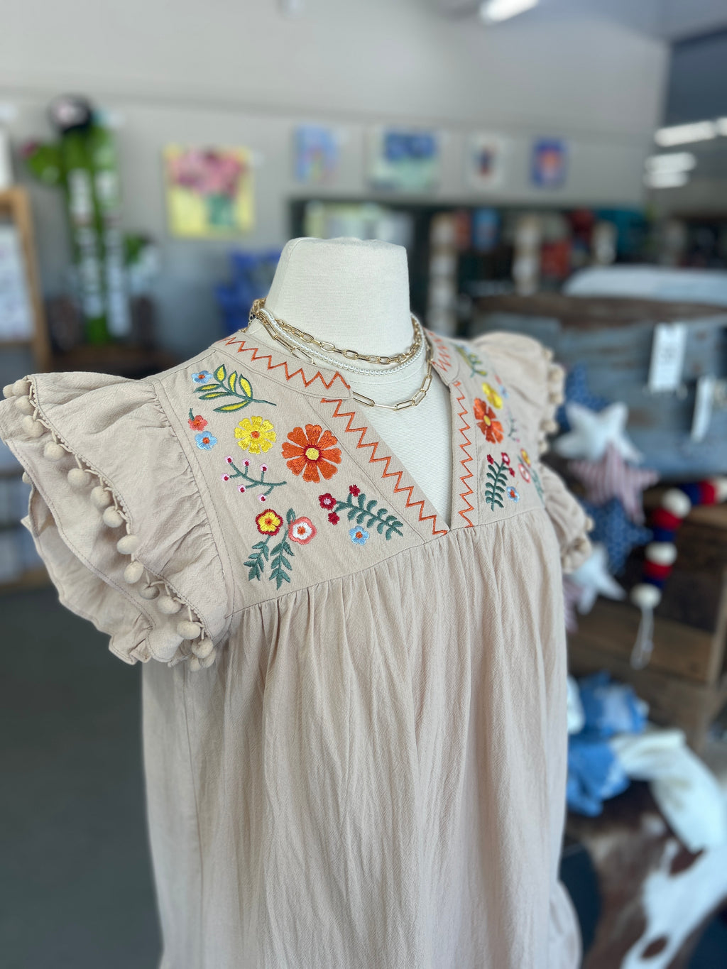 Women's Cream Linen Embroidered Pom Pom Flowy Sleeved Dress