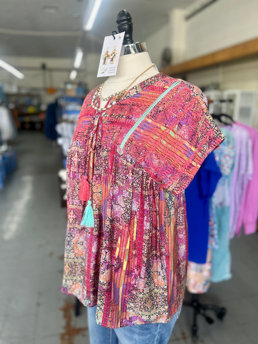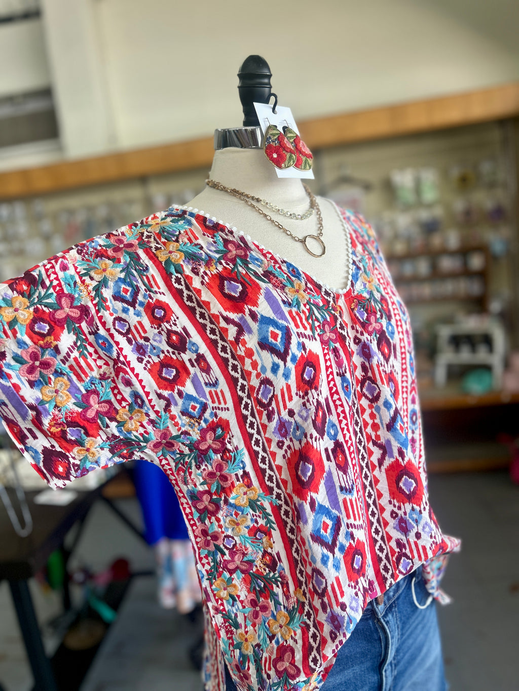 Women's Dolman Sleeve Red + Pink Print Short Sleeve Blouse